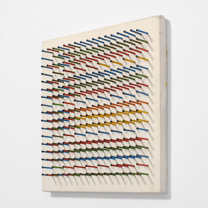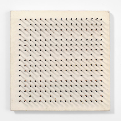 Chiodi colorati applicati su tela su tavola, cm 20 x 20 x 2