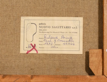 Azul y Amarillo, 1973Oil on canvas, cm 55 x 33Signed upper rightLabel and stamp Galleria Nuovo Sagittario, Milan on the backPROVENANCEGalleria Nuovo Sagittario, MilanPrivate collection
