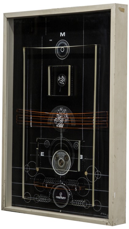 Assemblaggio, alluminio, materiale plastico e tecnica mista su tavola in box di legno e vetro, cm. 71,5 x 52,5 x 7