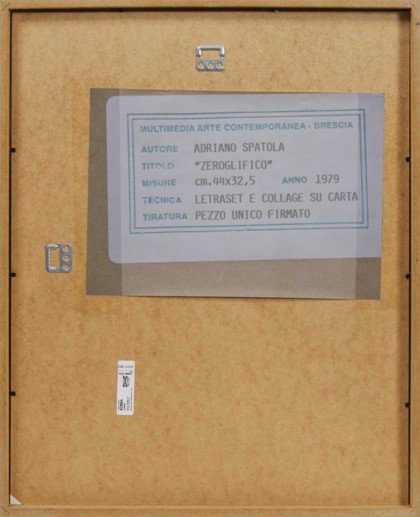 Zeroglifico, 1979Letraset e collage su carta, cm. 43 x 31 Firmato in basso a destra Etichetta Multimedia Arte Contemporanea, Brescia sul retroPROVENIENZAMultimedia Arte Contemporanea, BresciaCollezione Privata