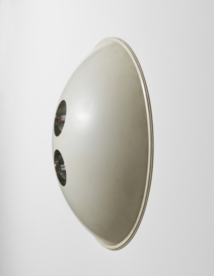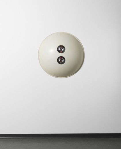 Due semisfere cromate entro plexiglas, diametro cm. 83