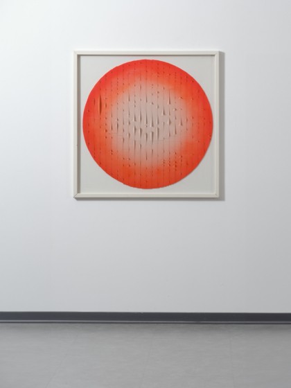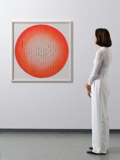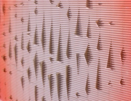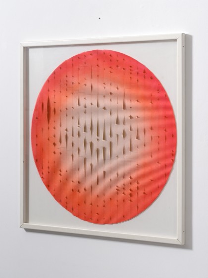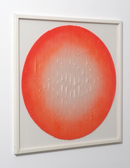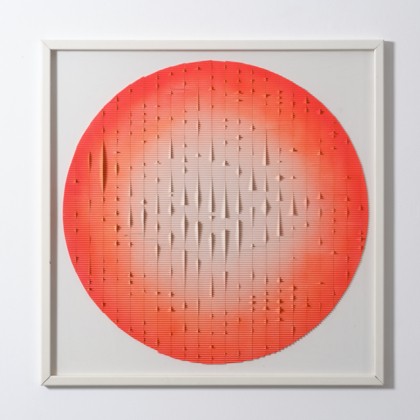 Pittura su plastica e lamelle applicate su tavola, cm. 100 x 100