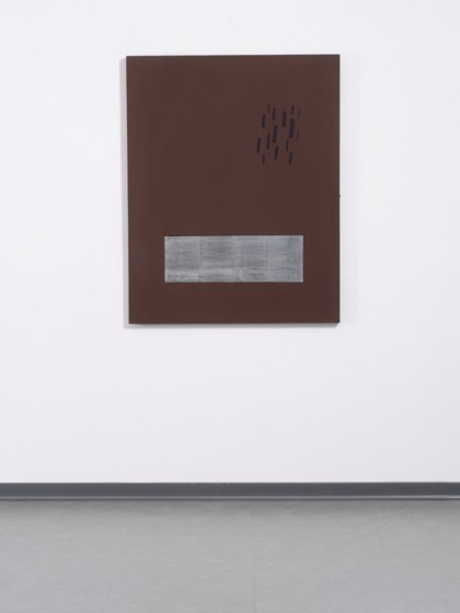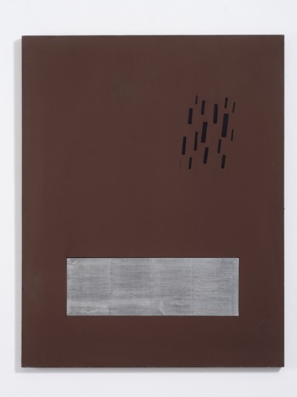 Acrilico e inserto di legno in foglia d'argento su tela, cm 116 x 92