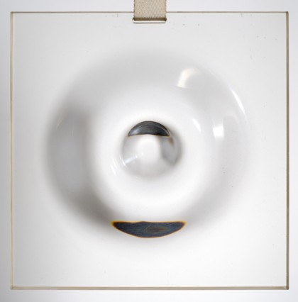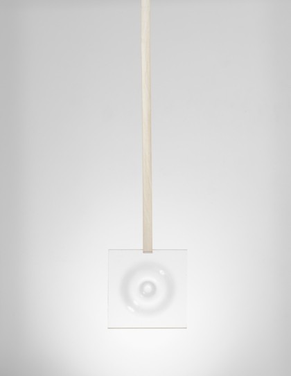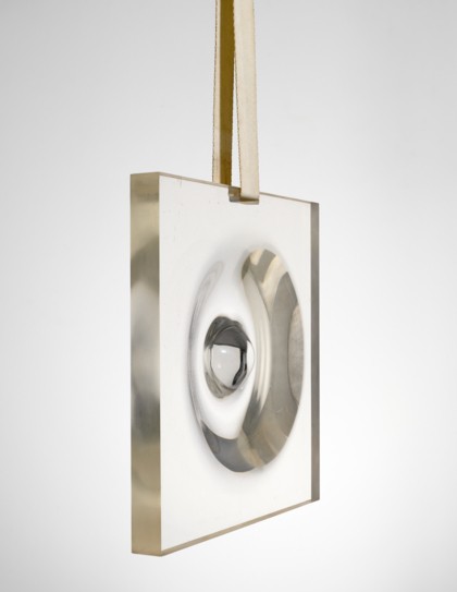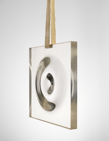 Scultura in materiale plastico trasparente, cinturino in tessuto, cm 35 x 35 x 3