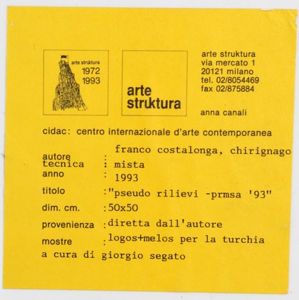 “Tra logos e melos, Dalla composizione logica alla modulazione costruttiva”, Turchia, Ankara, Galleria Belle Arti - Centro Ataturk; Izmir, Fondazione Vakibank; Antalj, Local Museum, 1995